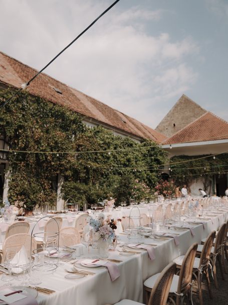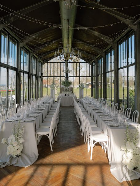 Natürliches Licht, klare Linien und 2 Lange Tafel im Mittelpunkt. Ein Wedding Design , das eine leichte, elegante und harmonische Stimmung schafft.